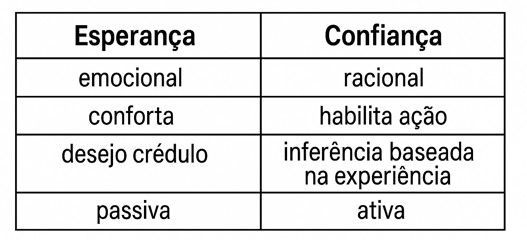 Duas atitudes que, por vezes, se confundem, esperança e confiança, envolvem sentimentos e crenças quanto ao futuro. Esperança é uma expectativa positiva de base emocional, que nasce do desejo, mas não o habilita. Espera-se que algo seja possível, mesmo sem evidências. Trata-se de esperar sem agir, de desejar sem saber. Verdadeira ou falsa, a esperança é uma crença desejante, um desejo crédulo, não necessariamente crível, mas sempre reconfortante.